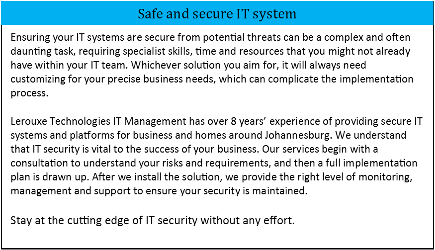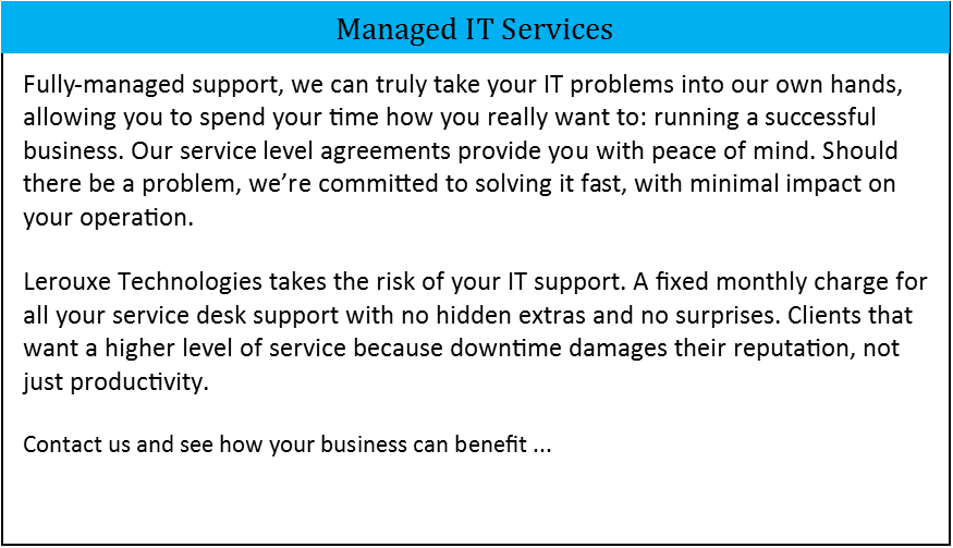 We've all done it - Clicked on a link we shouldn't have or opened an email attachment supposedly from someone you trust. Before you know it your computer is running slowly, showing popups or worse still, encrypting your files so you cannot access them. If you think you have a virus then contact Lerouxe Technologies as soon as possible and we'll get rid of any nasties lurking on it. We will offer you free advice after that and suggest even free products that you can use to stay protected.